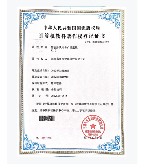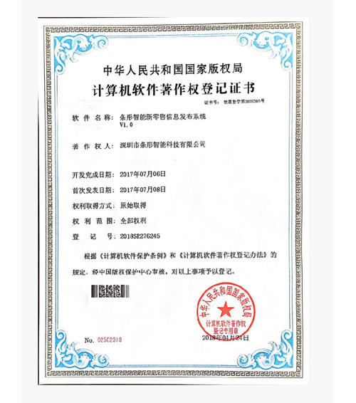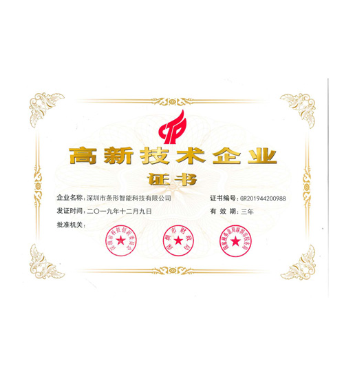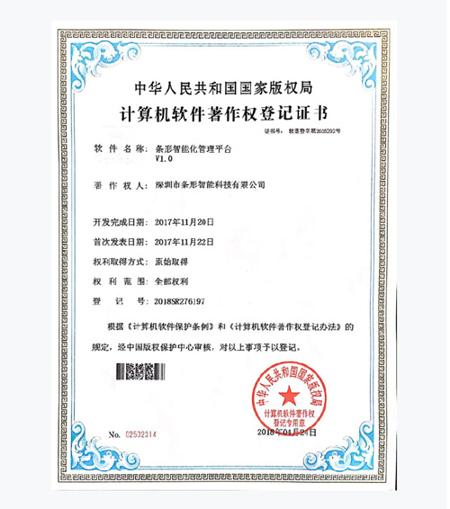 深圳條形智能先后通過(guò)并取得:全國(guó)工業(yè)產(chǎn)品生產(chǎn)許可證、ISO9001國(guó)家質(zhì)量體系認(rèn)證、CE認(rèn)證、多項(xiàng)發(fā)明和實(shí)用新型專利,及多項(xiàng)國(guó)家軟件著作權(quán)。